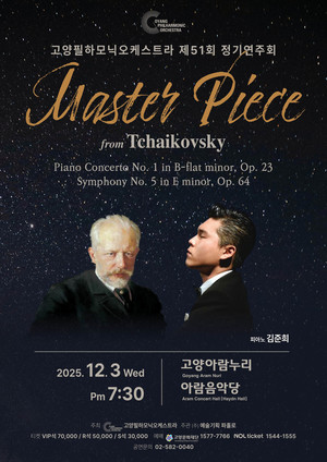 [고양신문] 고양필하모닉오케스트라(지휘 안현성)는 12월 3일 오후 7시30분 고양아람누리 아람음악당에서 제51회 정기연주회 ‘Master Piece from Tchaikovsky’를 선보인다. 이번 무대는 러시아 음악의 거장 표트르 일리치 차이코프스키의 대표작 두 곡으로 구성돼 낭만과 열정, 운명적 감정이 교차하는 러시아 클래식의 진수를 선사한다.프로그램은 웅대한 서곡과 폭발적인 감정선을 지닌 〈피아노 협주곡 제1번 내림나단조 작품 23〉, 인간의 내면과 운명을 드라마틱하게 그려낸 〈교향곡 제5번 마단조 작품 64〉로 꾸며진다.