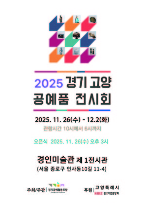 [고양신문] 경기공예협동조합(이사장 전진숙)은 11월 26일부터 12월 2일까지 서울 종로구 인사동 경인미술관 제1전시장에서 ‘2025 경기 고양 공예품 전시회’를 개최한다. 이번 전시는 경기지역 공예문화의 저변 확대와 지역 공예인 간 교류 활성화를 위해 마련됐다. 조합 관계자는 “공예산업의 가치 제고와 판로 확대를 위한 중요한 계기가 될 것”이라고 전했다.전시에는 조합 회원 43명을 비롯해 화성시공예사업협동조합, 남양주시공예인협회, 성남공예산업협동조합 등 경기지역 협력 단체들도 참여해 지역별·기법별 다양한 작품을 선보인다. 특히,