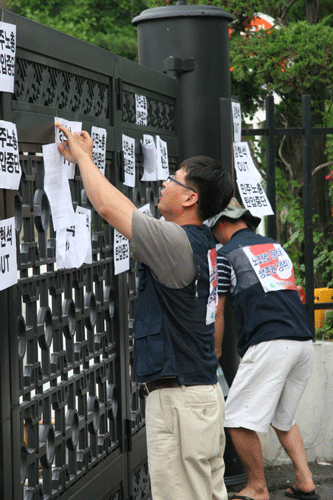 참가자들은 시청 정문에 ‘민주노총 탄압 중단’등의 내용이 담긴 메시지를 부착하며 고양시가 새로운 사무실로 이전을 지원할 것을 강력히 요구했다