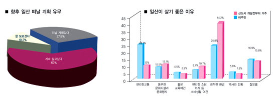 사람사는 곳에는 언제나 좋은 것보다는 불만이 더 많다. 일산신도시에 대한 평도 그렇다. 특히 토박이로 대대로 살아온 이들은 어렵게 지켜오고, 혹은 쫓겨났기 때문인지 속깊은 아쉬움을 드러낸다. 그러나 떠나겠느냐는 질문에는 75.8%의 토박이들이 “계속 살겠다”고 답했다. 전체 답변자의 62%, 이주민 59.7%와 비교되는 수치다. 일산에 이사온 지 5년 미만인 경우 43.9%, 5년~10년 32.4%, 10년~15년 29.6%, 15년~20년 12.9%의 답변자들이 떠날 계획이 있다고 답했다. 일산은 오래 살아야 그 맛을 아는 도시인 모양이다. 반대로 5년 미만 44.1%, 5년~10년 56.3%, 10년~15년 59.6%, 15년~20년 79.1%가 고양시에 “계속 살겠다”고 답했다.
