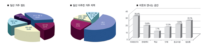 일산 이주 전 거주 지역은 서울시 52.9%(529명), 고양시 24.4%(244명), 고양시제외 경기도 12.6%(126명), 서울. 경기제외 기타 지역 10.1%(101명)이었다.