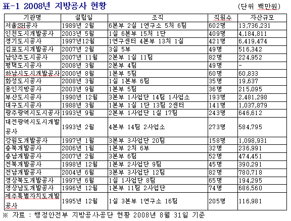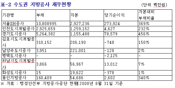 행자부의 지방공사·공단 현황에 따르면 2008년 8월 기준으로 전국 시ㆍ도 개발공사의 부채가 20조2043억원에 달하는 것으로 나타났다. 서울 SH 공사가 부채규모가 10조가 넘어서고 경기도시공사 역시 부채규모가 5조를 넘어섰다.