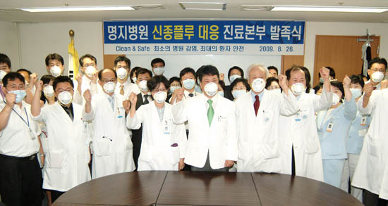 지난 달 26일 명지병원에서는 김형수 진료부원장을 본부장으로 하는 ‘신종플루대응진료본부’의 발족식이 열렸다. 병원측은 병원 외부 공간에 신종플루 진료실을 설치, 24시간 진료체제를 갖추기로 하는 것을 비롯, 병동 일부를 차단시켜 의증환자 격리 병동 및 확진환자 격리병실을 지정, 운영에 들어갔다. 매일 오후 6시에는 ‘신종플루대응본부’ 관계자가 참석하는 ‘상황회의’를 개최하여 실시간 상황을 점검하고 신속한 대응책을 마련하고 있다.