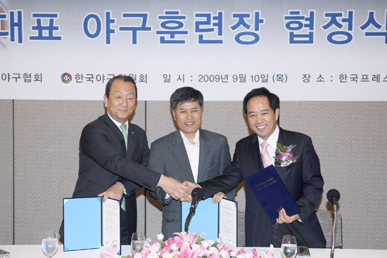 ‘고양 국가대표 야구훈련장’협정식이 강현석 고양시장, 강승규 대한야구협회장, 유영구 한국야구위원회 총재, 박용성 대한체육회장 등이 참석한 가운데 열렸다.