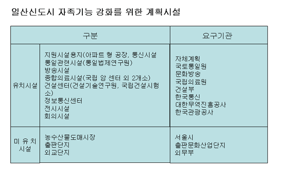 일산신도시의 계획 자체는 주거용 주택공급이 목적이었지만 전문가들이 그림을 그리기 위해 모이면서 자족도시로의 꿈이 시작됐다. 1989년 8월 정부는 신도시내 자족시설 유치 대상 자족기능시설을 설정한다. 당시 건설부에 제출된 일산신도시 기본구상은 일산신도시는 공공행정, 상업서비스 문화예술 등의 국제적 성격을 갖춘 도시로, 지방과의 연계가 낮은 기관들을 유치하고 대형유통, 레저시설을 갖춘 도시로 개발하도록 되어있었다.