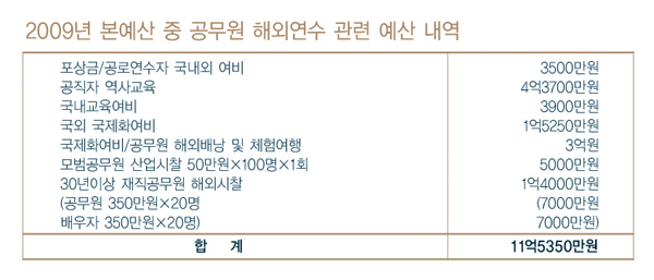 그러나 역사교육 이외에도 공무원들에 대한 해외연수는 매년 약 8억여원을 들여 진행되고 있다. 올해에도 공로연수자 국내외 여비 3500만원, 국외 국제화여비 1억5250만원, 공무원 해외배낭 및 체험여행 3억원, 모범공무원 산업시찰 5000만원, 30년 이상 재직공무원 해외시찰 1억4000만원 등이 본예산에 책정돼있다. 대부분은 장기 근속이나 업무 평가에 따라 선발돼 직무와 관련한 연수를 갖게 된다. 그러나 공직자 역사교육은 특별한 선발기준없이 전체 공무원들을 대상으로 하고 있어 교육의 실효성에 의문이 제기되고 있다.