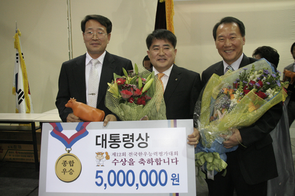 유완식 전국 한우협회 고양시 지부장이 20일 서울 삼성동 코엑스에서 제12회 한우 능력평가대회 종합우승인 대통령상을 수상했다. 이날에 앞서서 12일에는 송파구 가락동 축산물 등급 판정소에서 경매를 통하여 최고가의 두 배에 낙찰되기도 했다. 한국 종축 개량협회(한우 개량부)의 주관으로 열린 이번 제12회 전국 한우능력평가대회에는 전국 110농가에서 각 2두씩을 출품하였다.