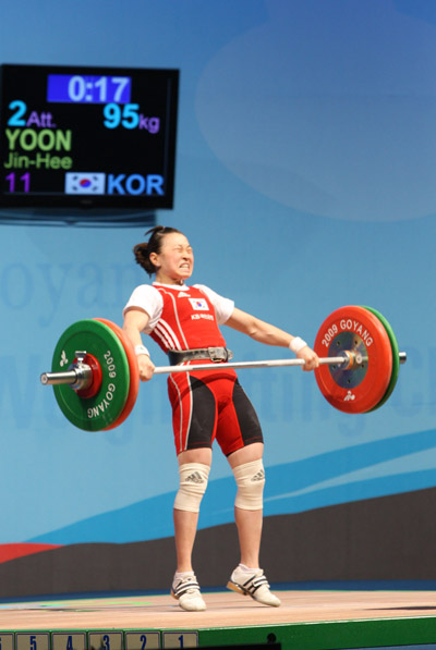 그러나 22일 경기에서는 한국 선수단의 첫 번째 메달이 터져나와 팬들을 기쁘게 했다. 이 날 여자 53kg급 경기에 출전한 윤진희 선수는 한국의 첫 번째 메달을 안겼다. 윤진희 선수는 인상에서 93kg을 들어올려 95kg에 성공한 중국의 첸 샤오팅 선수에 이어 은메달을 차지했다. 윤 선수는 또 용상에서는 116kg에 성공하면서 동메달을 차지했고, 합계 209kg으로 동메달을 목에 걸었다.