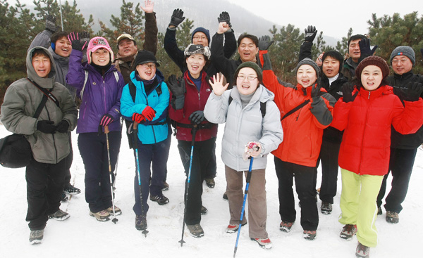 ▲ 고봉산 영천사를 지나 서설로 덮힌 산길을 걷는 고양올레 회원의 표정이 밝다.