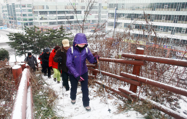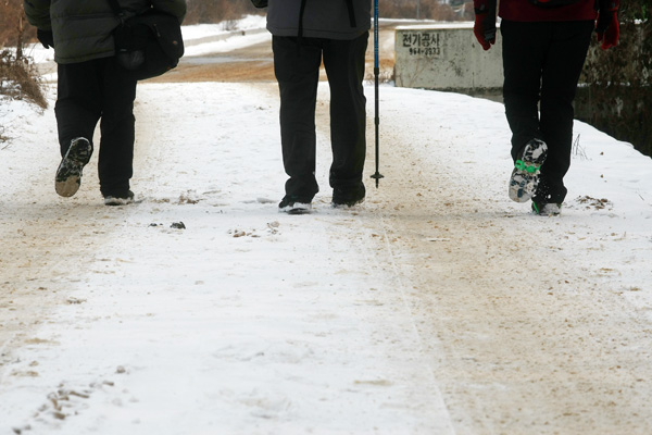▲ 눈길을 걷는 고양올레 회원들의 발걸음이 힘차다.