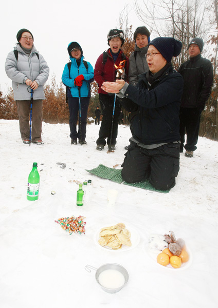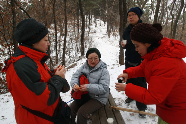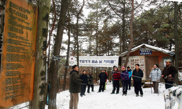 시행제를 지낸 고양올레 회원들의 발걸음은 한국전쟁 당시 양민학살의 아픔을 간직하고 있는 황룡산 금정굴로 향했다. ‘산자들이여, 우리를 기억하라’가 새겨진 고목 앞에서 최태봉 고양시민회 전 대표는 “당시 희생된 영령들의 명예회복과 더불어 이곳을 평화의 공원으로 조성하려는 계획이 있다”고 설명했다. 회원들은 이어 서설로 덮힌 황룡산 철책길을 지나 향토유적 제7호로 지정된 조선시대 완산부원군 이천우 묘역까지 이르렀다. 총거리 7.98 km, 3시간 반 남짓한 시간이 걸렸다. 쌀쌀한 날씨 탓이었을까, 혹은 새해맞이 걷기가 주는 성취감 때문일까. 첫걸음을 마친 회원들의 얼굴은 발갛게 상기돼 있었다.