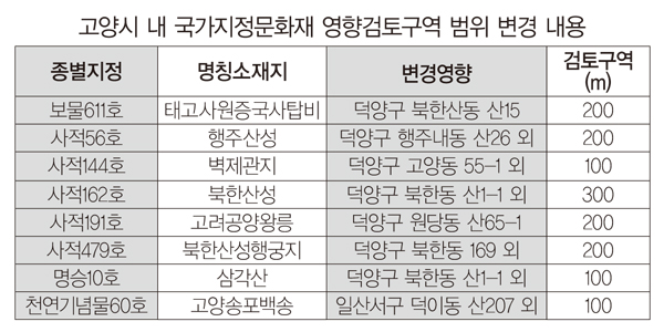 고양시에 있는 국가지정문화재 8곳의 영향검토구역의 범위가 축소되어 건물의 신축과 증개축이 쉬어진다. 따라서 행주산성, 공양왕릉, 벽제관지, 송포백송, 북한산성, 태고사 원증국사탑비, 북한산성 행궁지, 삼각산 등 고양시 내에 있는 국가지정문화재 8곳 주변 주민들의 재산권 행사가 종전보다 다소 쉬워질 전망이다.