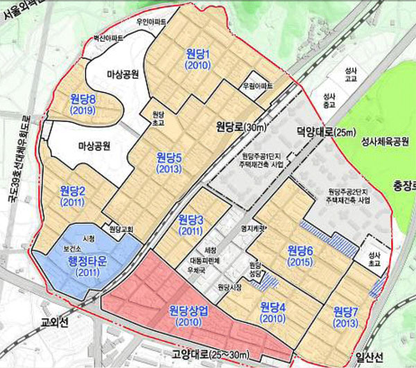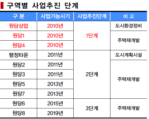 이 중에서 상업지구와 원당1구역, 원당4구역은 촉진구역으로 올해 사업이 바로 가능한 지역이다. 행정타운과 원당2구역, 3구역은 2011년, 원당5구역, 원당7구역은 2013년, 원당 6구역은 2015년, 원당8구역은 2019년 사업이 추진된다.
