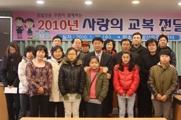 지역에 거주하는 저소득층 청소년 중 2010년도 중.고등학교 입학 예정 신입생 20명에게 교복 구입권을 전달하는 방식으로 이뤄진 이날 행사는 정발산동주민자치위원인 선진선(자영업,56)씨의 후원을 비롯해 마진을 뺀 가격에 교복을 제공하는 엘리트 학생복 일산 대리점 등 다방면에서 모여진 정성으로 이루어졌다.