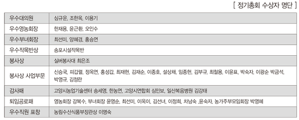 이날 총회에서는 지난 한 해 동안 각 분야에서 열심히 일해 준 조합원과 임직원에 대한 상장 전달식도 있었다. 수상자는 다음과 같다.
