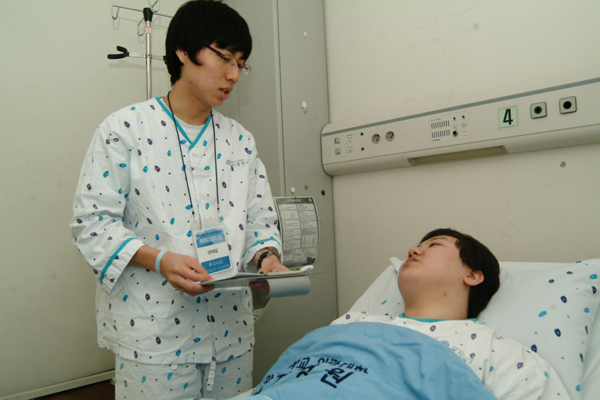 8일 오후 명지병원 대강당에서 산악인 허영호 대장의 ‘도전과 삶’을 주제로 한 특강으로 시작된 이번 연수프로그램이 진행됐다. 환자의 편에 서서 환자의 입장을 먼저 이해하는 의사가 되기 위한 ‘1일 환자체험 프로그램’은 관동의대 명지병원에서 실시되고 있다. 학생들은 아침부터 접수와 진료, 검사, 입원 수속 등의 과정을 거쳐 병실에 입원한 후에는 입원 환자들과의 면담을 통해 입원 생활의 불편함과 의료진에게 바라는 것 등을 알아가게 된다.