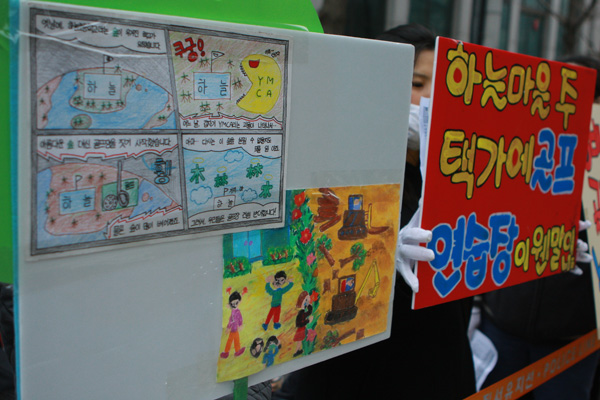 또한 이날 시위에 사용된 피켓과 플랜카드에는 하늘초등학교 학생들이 자신의 학교 처지를 표현한 그림들과 함께 ‘시장님께 쓰는 편지’를 낭독해 허가 취소를 간절히 호소하기도 했다.