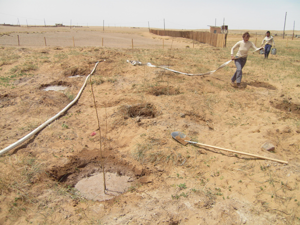 수종 선택도 쉬운 일은 아니었다. 숲의 다양성과 건강성을 유지하면서도 황사를 효율적으로 막을 수 있는 나무가 선택됐다. 키작은 비술나무, 포플러, 버드나무와 차차르간이 키 순서대로 식재됐다. 4월말~5월말 나무를 심게 된다. 식재는 여러 단계로 나누어 진행된다. 우선 구멍을 파고, 구덩이를 가득 채울 정도로 물을 넣은 다음, 거름을 주고, 모래를 나무의 뿌리가 덮일 정도로 넣어준다. 나무가 지면에서 곧추 서게 한 후 발로 다지고, 구덩이 주위에 나무가 충분히 수분을 흡수할 수 있을 만큼의 물막이를 만든 후 다시 충분하게 물을 주어야 한다.