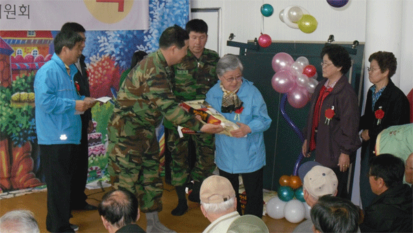 지난 6일 삼송 4·5통 노인정에서 벌어진 ‘어버이날 경로잔치’행사에서 인근 군부대가 어르신들을 위한 물품을 전달해 미담이 되고 있다. 제1공병여단(여단장 권태환 준장)은 이날 어르신들을 위해 쌀 12포(1포 10Kg)를 비롯해 술과 음료수를 제공했다.