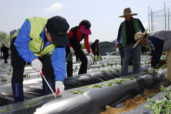 송산동 통장협의회와 주민자치위원회 및 주민센터 직원 등 30여명의 봉사자들이 이른 아침부터 고구마 순 60단을 심었다.