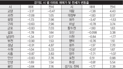 경기지역 27개 시중에서 아파트 매매가 상승을 기록한 시는 포천시(0.51%)와 평택시(0.26%) 두 곳 뿐이며 나머지 25개 시는 모두 하락세를 면치 못했다.
