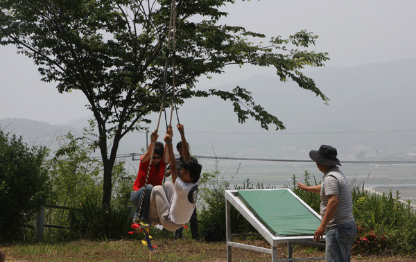 우리 일행과 같이 동행한 영광군 행정지원과 강명원 계장은 “영광 단오제의 주요행사인 그네뛰기 대회는 전국적으로 유명하다”며 “그네가 7∼8m 가까이 높이 올라가기 때문에 그네를 타는 사람도 이를 지켜보는 사람도 아찔하다”고 말했다. 그는 이 대회에서 실제로 사고가 난 적이 있었다고 한다. 그네뛰기 대회장 한 편에 마련된 무대에서 우리와 동행한 중요무형문화재 57호 경기민요 이수자인 신월숙씨가 조상현 선생에 이어 경기민요를 선보이기도 했다.