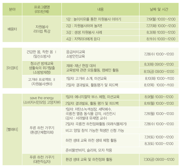 고양시종합자원봉사센터(센터장 허경남)에서는 여름방학 중 이웃과 지역사회를 위한 나눔과 배려의 활동을 실천하는 학생 자원봉사 프로그램 ‘고려청자’를 7월 19일부터 8월 19일까지 운영한다.