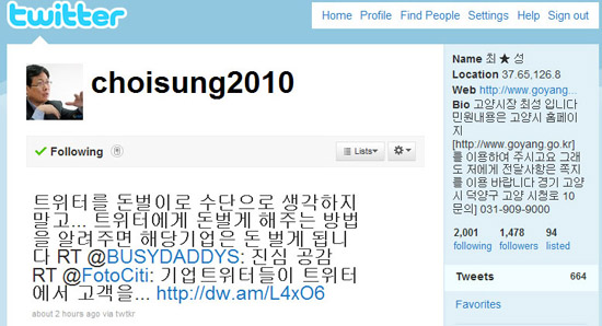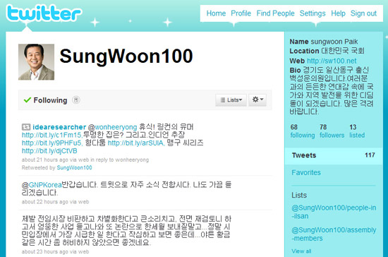 백성운 국회의원과 기자의 대화다. 이 대화는 SNS(Social Network Service)로 불리는 트위터 상에서 이뤄졌다. 최근 트위터와 페이스북에 동참하는 고양시민들이 늘어나면서 또하나의 고양시가 사이버공간에서 만들어지고 있다. 일반 시민들이 소소한 나눔과 소통의 공간으로 활용하는 것은 기본. 최성 시장(choisung2010), 백성운 의원(SungWoon100) 등 정치인들까지 참여해 시정과 의정을 알리고 의견수렴 공간으로도 활용하고 있다.