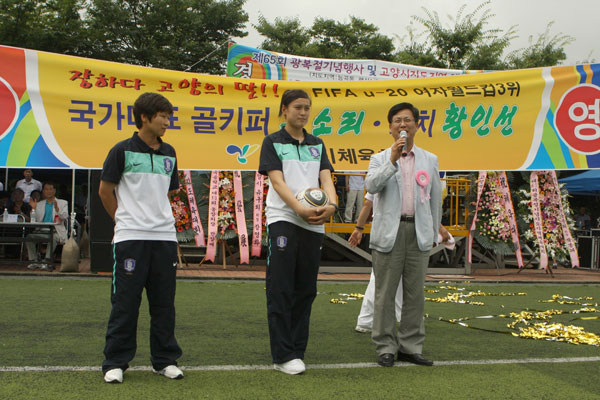 오전에는 선수입장과 개회선언 및 장순복 지도체육회 회장의 대회사, 내, 외빈 축사가 있었다. 특히 눈길을 끌었던 것은 ‘2010 FIFA U-20 여자월드컵’ 국가대표인 문소리(20세·울산과학대)씨가 최 시장을 비롯한 고양 인사들과 공을 차고 막는 시범을 보이는 장면이었다. 문 선수는 현재 덕양구 토당동에 살고 있으며, 능곡초등학교에 다닐 때부터 축구선수로서의 꿈을 키웠다고 한다.
