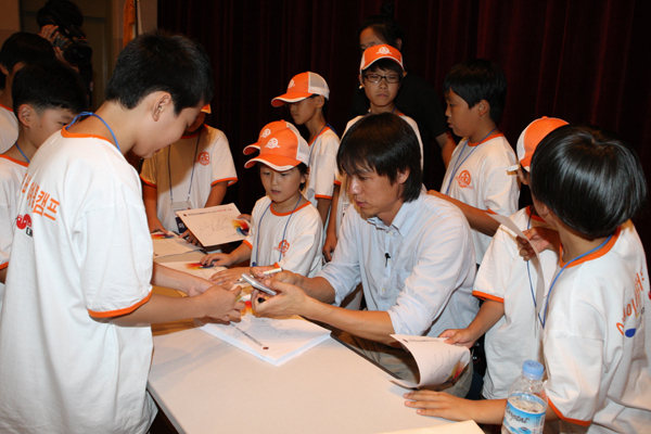 ‘고양대교 여자축구단’ 어린이 서포터즈 여름캠프. 고양대교 여자축구단 어린이 서포터즈들이 경기도 시흥시 대교 RHD센터에서 열리는 여름캠프에서 홍명보 올림픽 축구대표팀 감독으로부터 생생한 축구 경험과 축구에 대한 강의를 진지한 표정으로 듣고 있다.