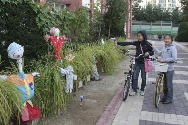 요즘엔 아이들이 학원 가느라 오후만 되면 학교가 텅텅 비어서 허수아비마저 심심하여 긴 하품을 토해내는데, 마침 자전거를 가지고 이곳에 놀러온 김동희, 임윤지(5학년/오른쪽부터) 양은 “허수아비가 심심하지 않게 친구가 되려고 왔으며, 들판에 안 나가도 학교에서 가을의 모습을 볼 수 있어서 기뻐요”라고 하며 즐거운 시간을 보내었다.