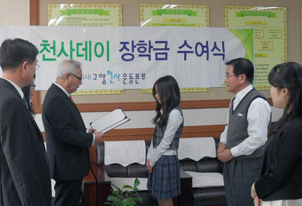 천사데이를 맞이해 전달된 이번 장학금은 천사운동본부에서 1구좌당 작게는 1004원부터 많게는 수십여 만원까지 모아진 천사들의 기부금이다. 장학금은 1700여명의 기부천사를 통해 모아진 기부금을 어려운 환경이지만 환경에 굴하지 않고 상위 성적 10%에 있는 학생들에게 학교에 직접 찾아가 장학 증서를 전달한 것이다.