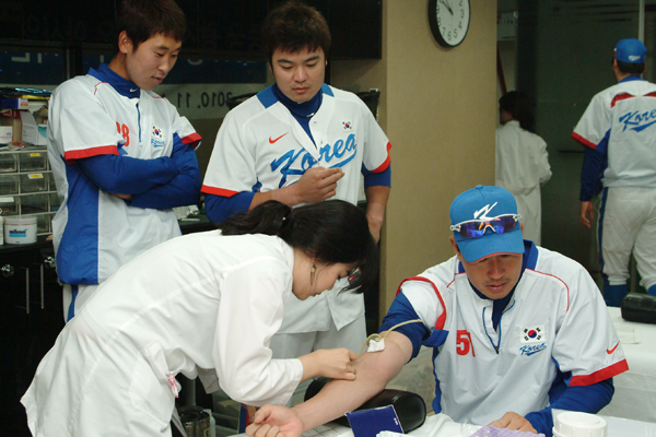 관동의대 명지병원(이사장 이왕준)은 1일 부산 사직구장에서 ‘2010 광저우 아시안게임에 출전하는 야구 국가대표선수들의 건강상태를 최종 점검하는 건강검진을 실시했다. 추신수 이대호 류현진 봉중근 등 한국을 대표하는 간판 스타들을 비롯한 27명의 대표선수들이 모두 참가했다.