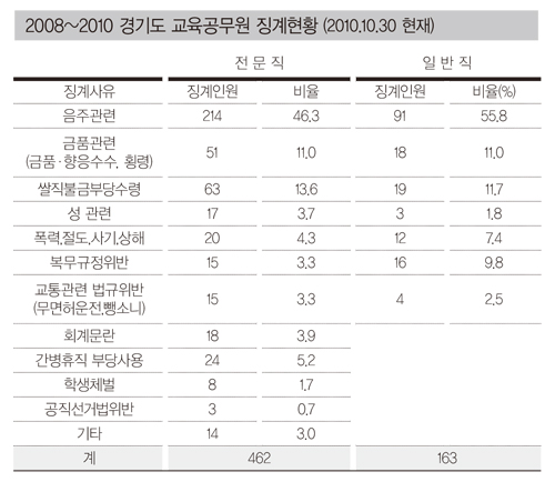 2008년부터 올해까지 경기도교육청 징계현황 자료에 의하면 일반직 공무원 163명과 전문직 공무원 462명이 징계를 받은 것으로 파악됐다. 징계현황에 따르면 일반직은 91명이, 전문직은 214명이 음주운전과 관련해서 징계를 받았다.