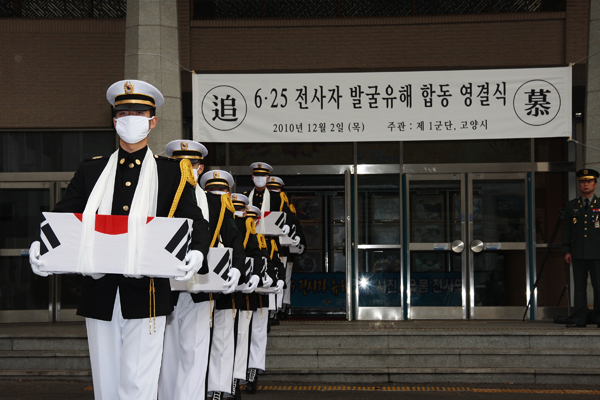 육군 1군단은 2일 오후 2시 고양시문예회관에서 고양시와 공동주관으로‘6·25전사자 유해발굴 합동 영결식’을 거행했다. 행사에는 9사단장 정태희 소장과 최성 고양 시장, 장재욱 의정부 보훈지청장을 비롯한 고양, 파주, 양주 보훈 안보단체회원, 유해발굴에 참여했던 장병과 시민 등 250여명이 참석했다.