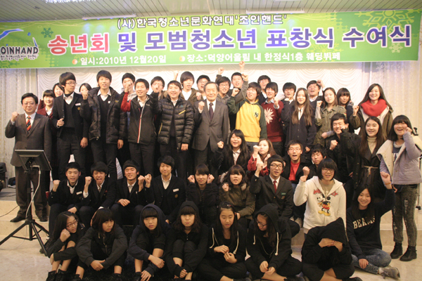 찬바람이 불던 20일, (사)한국청소년문화연대 조인핸드(회장 박상돈)는 ‘2010 조인핸드 송년회 및 모범청소년 표창’을 했다. <사진> 어울림 한정식 뷔페에서 열린 이날 행사장에는 최성 고양시장, 김태원 국회의원, 한학수 고양 문화원장을 비롯하여 조인핸드 청소년 기획단과 고양시 청소년 관계자 등 100여 명이 참석했다.