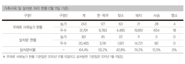 고양시에서 사육되는 우제류 총 가축수는 2010년 12월 기준으로 총 3만1791마리다. 고양시의 우제류 총 가축수 대비 살처분 가축의비율은 64%수준이다. 가구수로 따지면 우제류 가축을 기르는 총 가구수 243가구 중에서 34%인 83개 가구가 피해를 입은 셈이다.