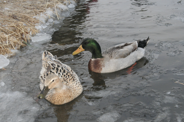 호수공원 연꽃 군락지에서 겨울을 나고 있는 다정한 청둥오리 모자. 백석동 김연옥씨의 정성어린 보살핌으로 겨울 한파도 거뜬히 견뎌내고 있다. 새벽마다 5평 남짓한 얼음을 깨어주면 고마움에 꼬리를 쫑긋 올리며 차가운 물살을 가르고 있다. 한쪽 깃털이 부실한 아들 청둥오리를 엄마 청둥오리(사진 왼쪽)가 곁에서 다정하게 지켜주며 돌보고 있어 찡한 감동이 전해진다.