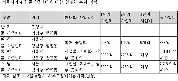 서울에 있는 3곳의 물재생센터에 대해서는 현대화 사업을 위한 엄청난 액수의 투자계획이 세워진 반면 고양 현천동에 위치한 난지물재생센터에 대해서는 투자계획이 전무한 것으로 확인됐다.