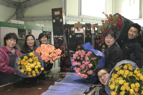 일본 학생들의 3월 졸업과 입학식에 사용할 장미를 작업하던 이충민 씨(사진 오른쪽 맨 뒤편)는 “꽃과 생활하여 마음이 즐겁고 직원들 단합도 꽃처럼 화사하게 이루어진다”고.