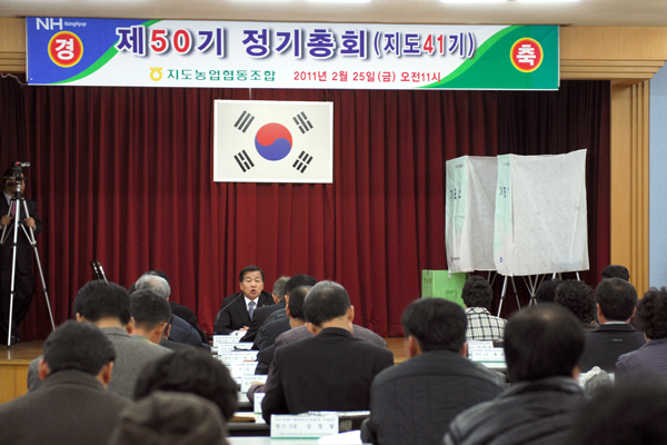 지도농협(조합장 정순환) 제50기 정기총회(지도41기)가 25일 토당동 지도농협 본점 2층 대강당에서 열렸다.