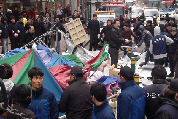 고양시청 앞에서 장기 시위를 하고 있는 철거 세입자 김철규씨 등이 주거해오던 행신동 SK뷰 아파트 앞 천막에 대해 결국 덕양구청이 행정대집행을 실시했다. 10일 덕양구청은 ‘도로법’ 제45조(도로에 관한 금지행위) 위반 및 ‘행정대집행법’ 제3조에 의거 오후 2시부터 구청 공무원과 경찰 등 100여명과 만일의 사태에 대비하여 응급구급차까지 동원해 행정대집행을 진행했다.