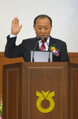 정명훈 조합장<사진>은 “조합원 여러분들의 적극적인 지지 속에 다시 이 자리에 설 수 있게 된 것을 무한한 영광으로 생각한다”며 “조합의 주인이자 오늘 취임식의 진정한 주인인 조합원들께 한 분 한 분 꽃을 달아드리고 싶지만, 그렇지 못한 것이 아쉽기만 하다”고 진심어린 마음을 전했다.
