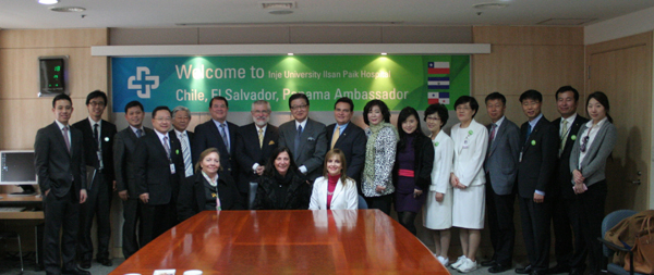 주한 네덜란드, 파나마, 엘살바도르, 칠레 4개국 대사 부부가 18일, 25일 양일에 걸쳐 인제대학교 일산백병원을 방문해 병원현황 대한 소개를 받고 주요 장비와 시설 등을 둘러보며 주한 각국 대사관과 일산백병원 간의 의료협력방안과 네트워크 구축에 대해 논의하는 시간을 가졌다. <사진>
