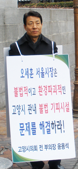 이러한 사실이 밝혀진 다음날인 3월 10일 경기도의회 이재준, 민경선의원, 환경운동연합 박평수위원장과 함께 서울시청에서 1인 시위를 시작하였다. 이후 고양시의원과 경기도의원들이 1일 혹은 2일씩 응원하며 같이 시위에 참여하였고 자말적인 시민까지 참여하여 시위의 효과를 더욱 배가시켰다. 더욱 고무적인 것은 안산, 평택, 수원 등의 지역구 도의원들이 1인 시위에 참여하여 동료의원들을 격려하고 경기도의 현안이기도 한 서울시 기피시설 문제 해결에 적극 동참하는 계기가 되었다.