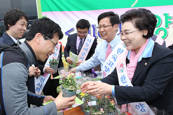 대전역, 광주고속터미널, 창원광장, 부산역 등에서는 고양시립합창단원들의 멋진 합창으로 분위기를 고조시킨 가운데 최성 시장과 김필례 시의회의장이 준비한 꽃 화분 3500개와 꽃전시회와 고양시 홍보물 5000부를 일일이 시민들에게 나눠주었다. 대전역 광장과 광주광역시 광천터미널에 있는 대형 전광판에는 고양시 홍보동영상이 홍보활동 시간 내내 상영되었다.