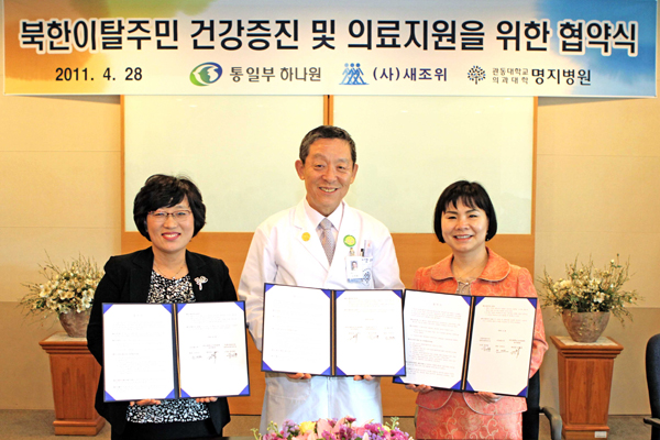 관동의대 명지병원(병원장 김세철)은 지난달 28일, 통일부 산하 북한이탈주민 정착지원사무소(하나원)와 사단법인 새롭고 하나된 조국을 위한 모임(이하 새조위) 등과 함께 의료협약을 체결하고 북한이탈주민들의 건강증진과 의료지원에 나서기로 했다. 이 날 협약식에는 김세철 명지병원장과 윤미량 하나원소장, 신미녀 새조위 대표 등이 참석했다.