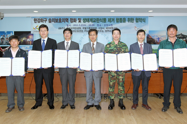 고양시는 23일 시청 시민컨퍼런스룸에서 한강유역환경청, 국립식물검역원, 제9보병사단, 고양환경운동연합, PGA습지생태연구소, 행주어촌계와 ‘장항습지 정화 및 생태계교란식물 제거활동’ 협약식을 체결했다.<사진>