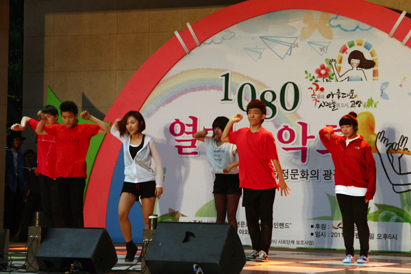 새 단장이 한창인 덕양구 화정 로데오 명품거리 화정중앙공원 야외무대에서 21일청소년들이 노래와 춤, 신나는 공연을 선보였다. 고양시가 후원하고 (사)청소년 문화연대 조인핸드에서 주최한 1080열린 음악회. 비가 오는데도 청소년 댄스팀에게 아낌없는 박수와 환호를 보내며 뜨거운 열기를 발산했다. 화정동 청소년 문화의 거리에서는 ‘청소년 문화한마당’행사가 11월 12일까지 매월 2ㆍ4째 토요일 낮 12시부터 저녁 8시까지 열린다