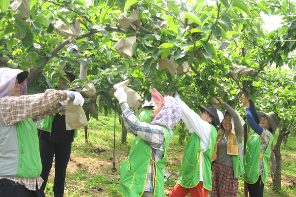 지도농협(조합장 정순환)이 지난달 21일 파주시 군내면 번원리 이철형씨 배과수 농가 배밭에서 지도농협 고향주모 농가주모 회원들과 행신2동 부녀회장단이 참여한 가운데 배봉지 씌우기로 일손돕기를 진행했다. 일손이 부족한 농번기 때 여성조직이 자원봉사를 나선 것.